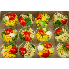 Айсберг, чери, моцарела, царевица, дресинг, паста, песто, чери, рукола